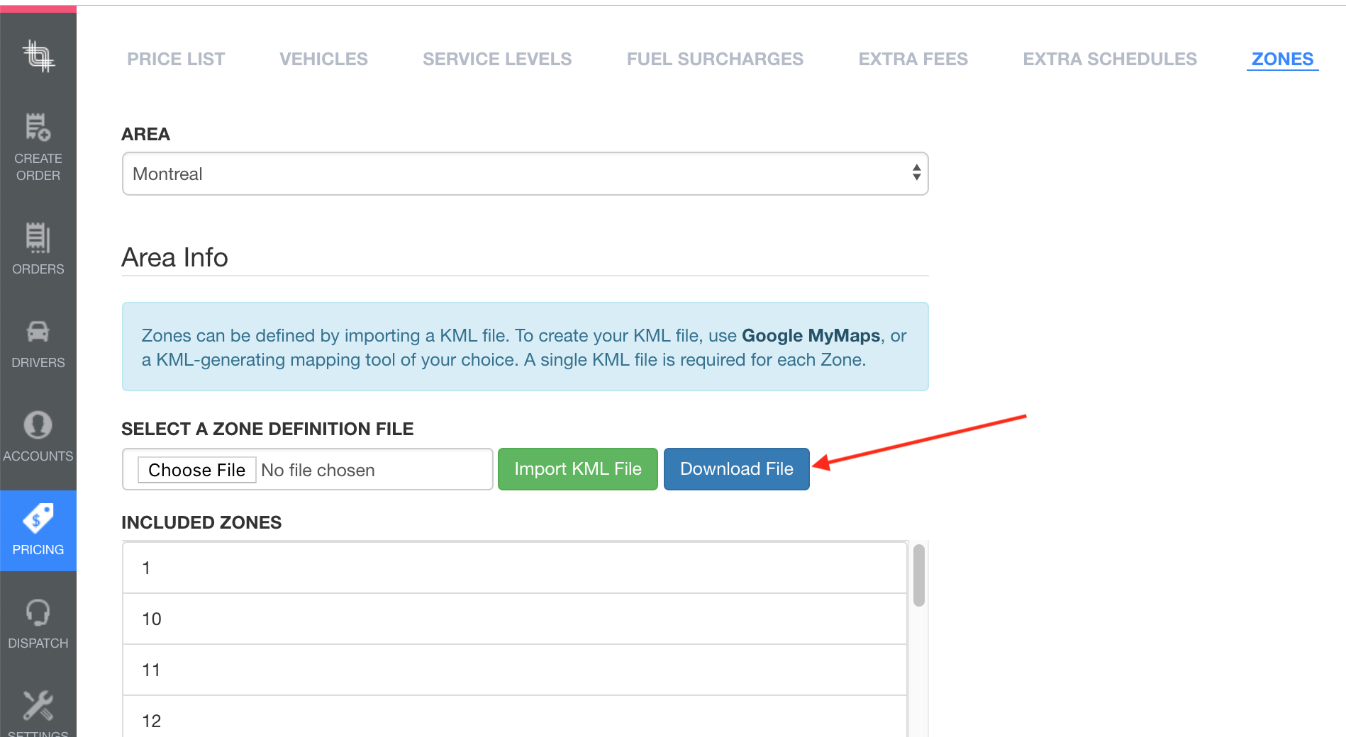 Pricing zones within a zone area can be downloaded to a KML file to be modified.