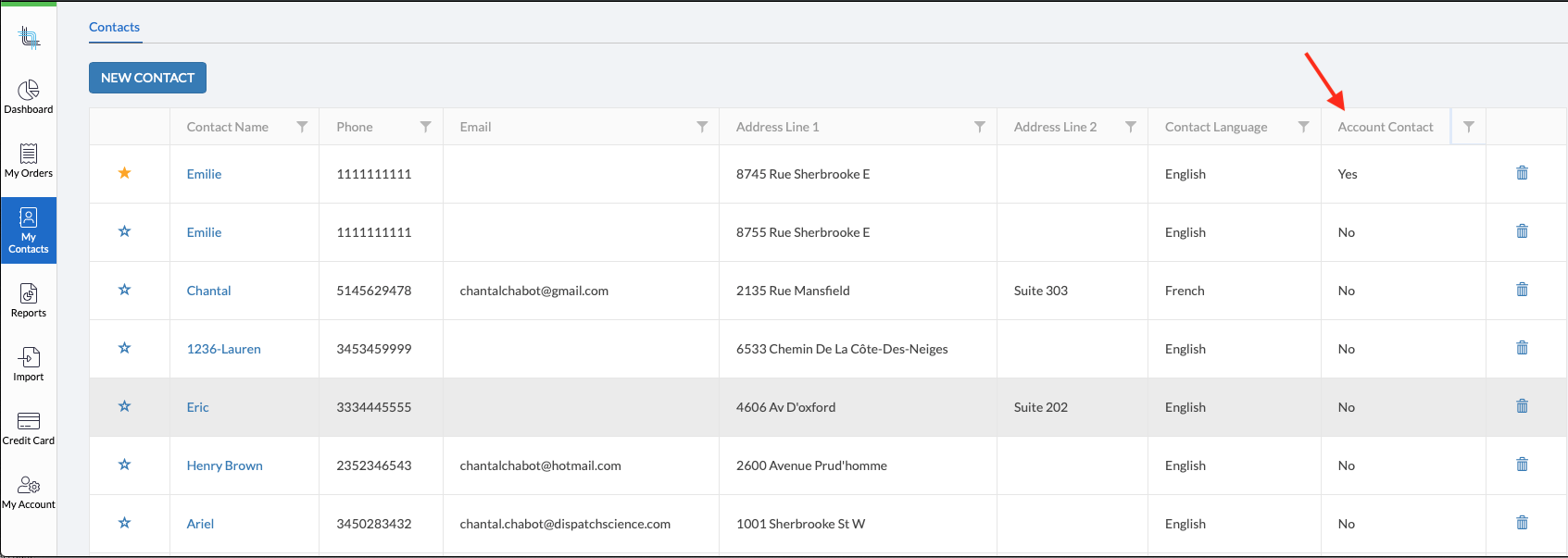 Note: Only Account admins can create, display, edit, delete account contacts. Account users will see them in their pickup and delivery list of contacts along with their own contacts and will be able to select them when creating an order.