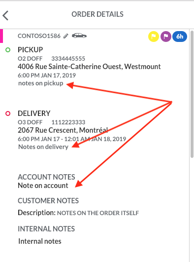 The content of the note will display in the order details under the pickup and delivery address along with the Account note.