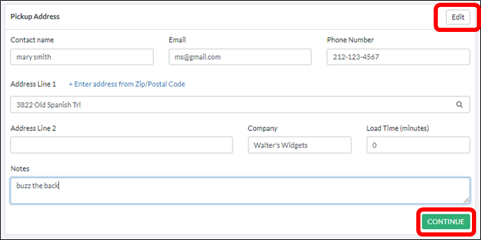 To finish, add any information needed in Address Line 2, add Company name, expected Unload Time and Notes. Click the green CONTINUE button to move on the the next section.