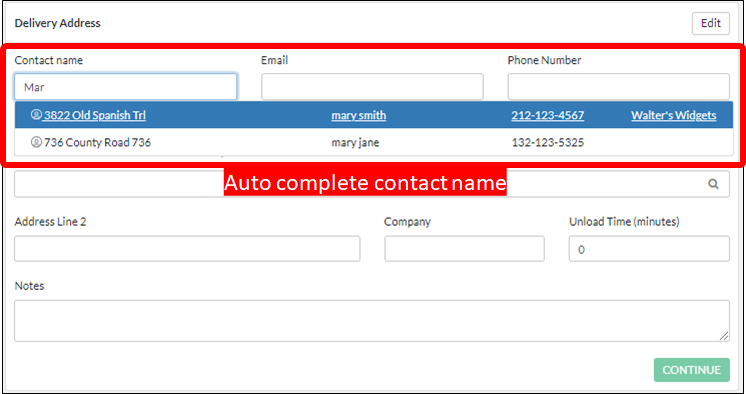 2.1) Start typing a name in the Contact name section. After typing the 3rd letter, our Auto Complete feature will kick-in and if the name you are looking for is in your contact list (Hint: see managing your contacts section for details), it will appear in a dropdown. Select the contact you are looking for and the rest of the Delivery Address section will automatically be populated with the information from your address book. Click the green CONTINUE button to move on the the next section.