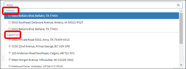2.3) Start typing an address in the Address Line 1 section. After typing the 3rd letter, our Auto Complete feature again will kick-in and address suggestions will start appearing in the dropdown. The more you type, the fewer the options will be displayed in the dropdown. Select the address you are looking for in the History or Suggestions sections and the Address will automatically be populated.
