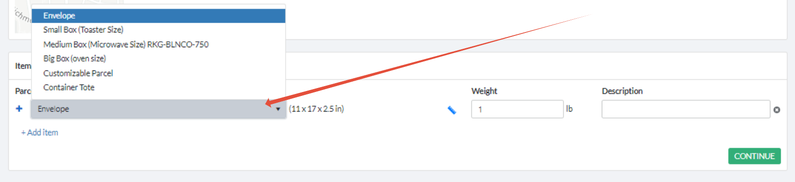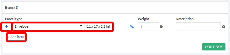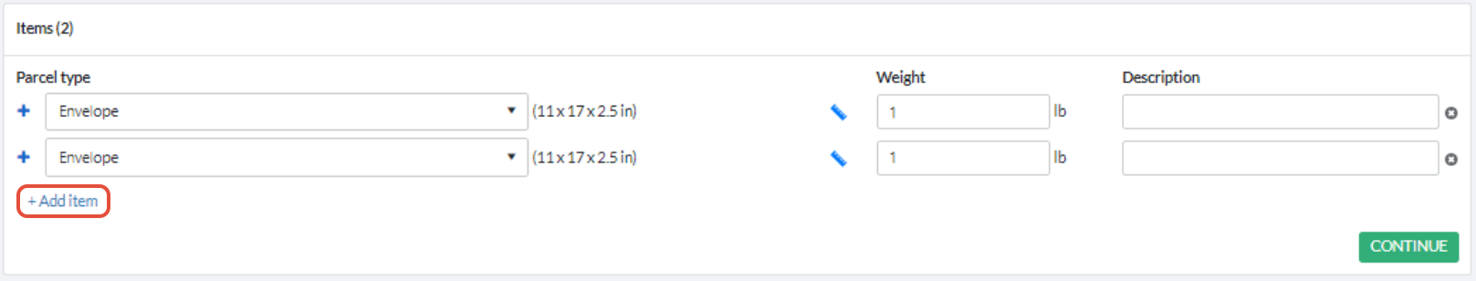 Input the weight and an optional description for each item, and click CONTINUE to move on to the next section.
