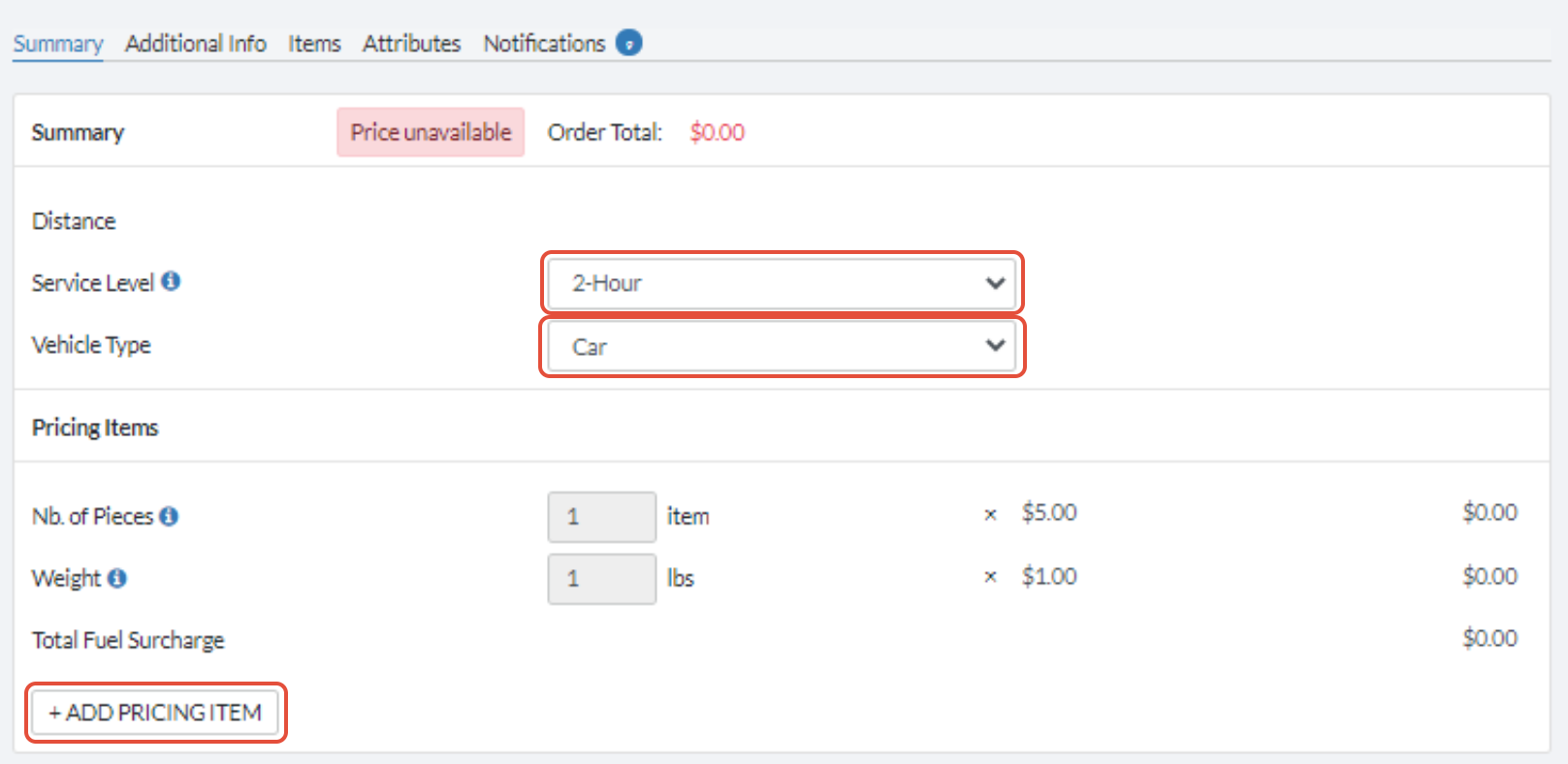 This is where you might see a price estimate on the basis of the pick-up and delivery addresses and items listed. You may also be able to choose a service level and vehicle type for your delivery, and add additional pricing items: