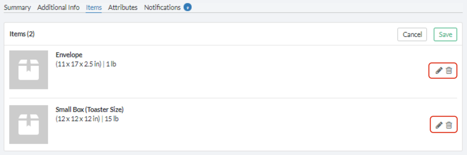 This is the tab that allows you to add details about the items in your order. Click on Edit to add or modify the information about each item in the order. Click on the pencil icon to modify the item or the trashcan to remove the item: