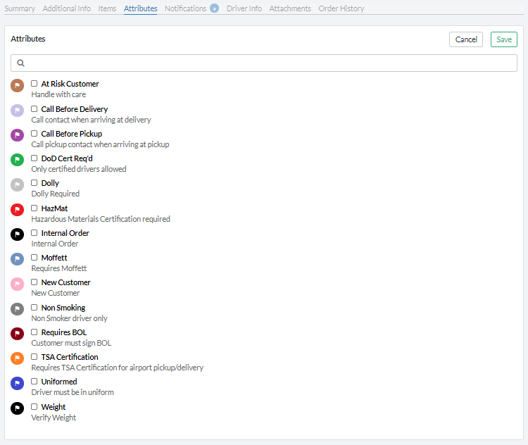 If available, this tab will allow you to ask your carrier to apply specific attributes to your order: