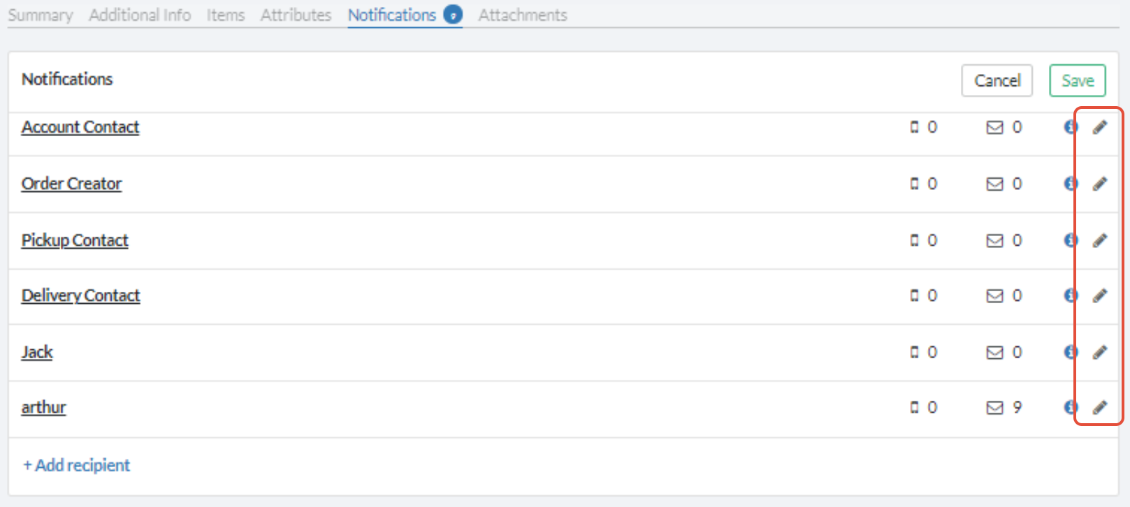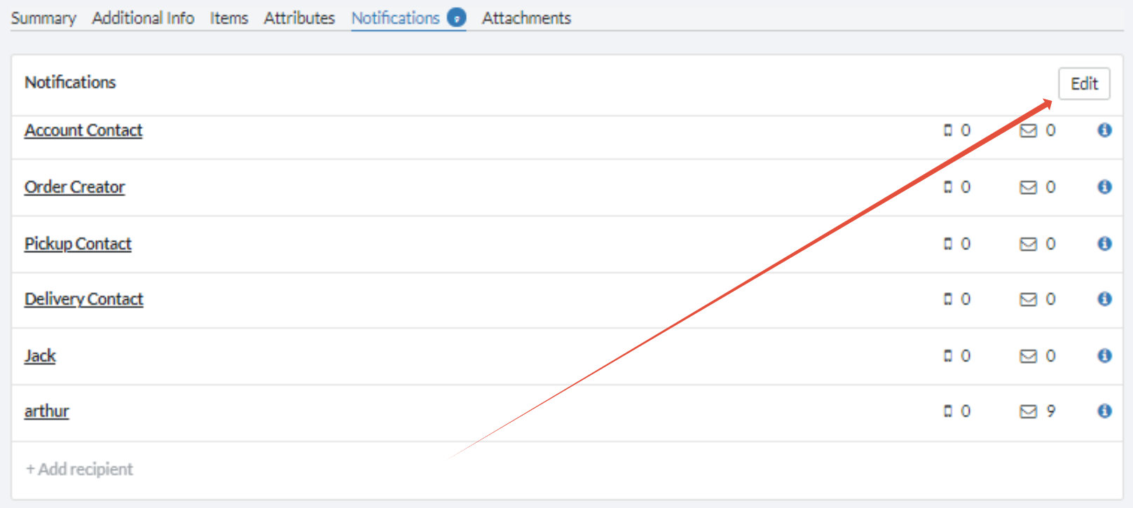 If available, the Notifications tab will allow you to specify what notifications are to be sent and to whom. Click on Edit to change the default notifications for that order: