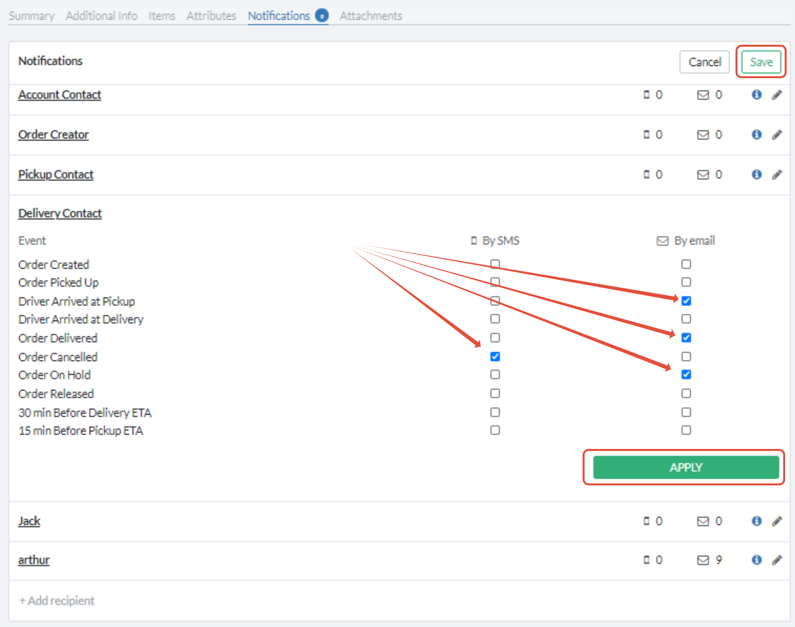 Add checkmarks to the types of notifications you want the system to send and click APPLY, then Save to save your notifications settings for this order: