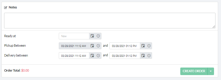 In this section, you will be able to add special notes for your carrier and driver, determine the expected date and time the order is expected to be ready (default is Now), and establish the pick-up and delivery windows for your order. Depending on the service level you selected in section 4, you may have restrictions to your available pick-up and delivery windows.