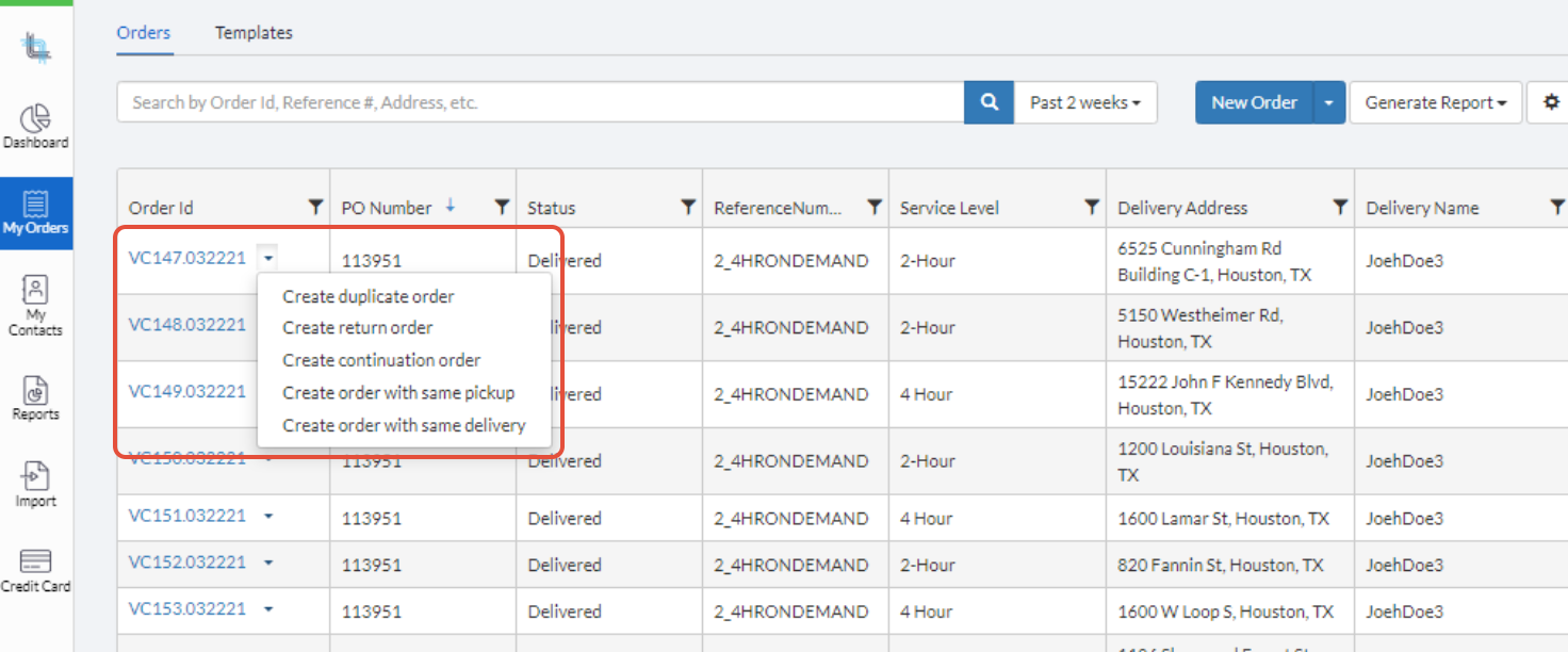 Hint: You will also find the blue New Order button in the My Orders section of your portal. Another way to quickly start creating an order is to click on the chevron next to an order in your My Orders table and selecting from the list of available options: