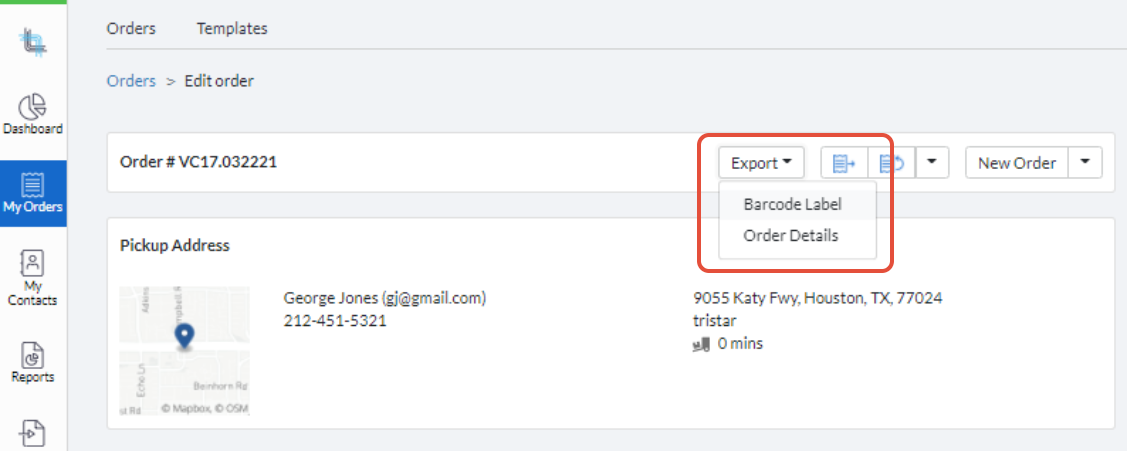 Hint: Here's a handy tool if you need to create a barcode or a printable Order Details form for an order you just created. Simply open an order and click on the Export dropdown:When you select Barcode Label, a ready-to-print barcode label will automatically be created using the Order ID as information for barcode generation: