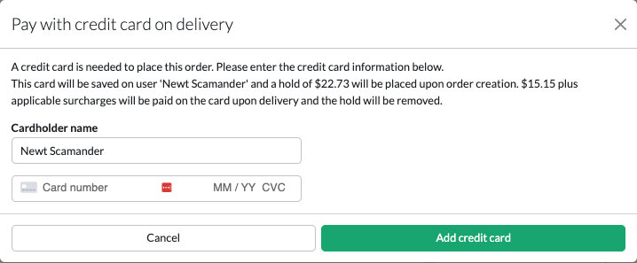 When no credit card is set on the Account or the User, depending on the setting in the Account's Credit Card Option, a dialog box will display asking the internal user to enter the credit card instead of displaying the error message on the Order: