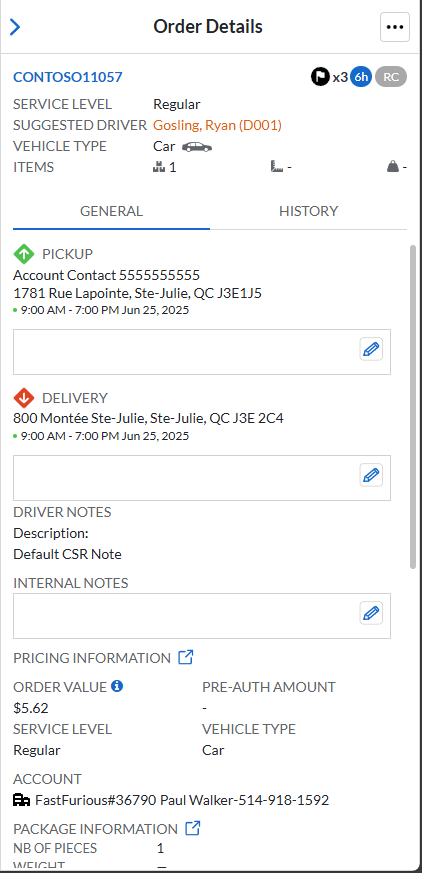 The Order Detail Sliding Panel also reflects suggested driver details with the following rules: