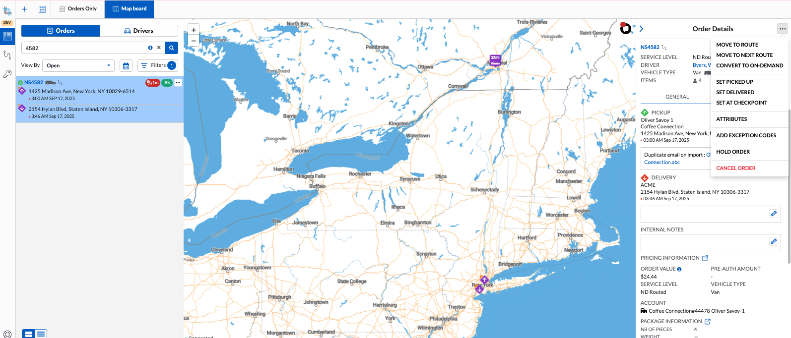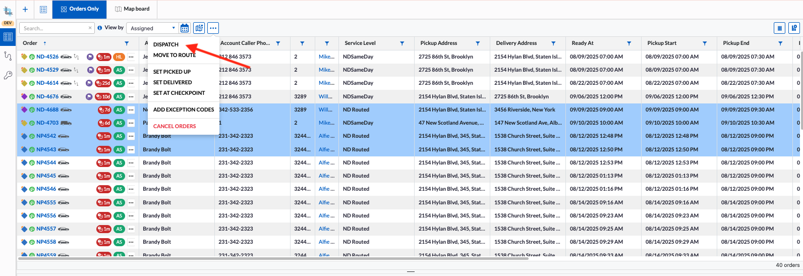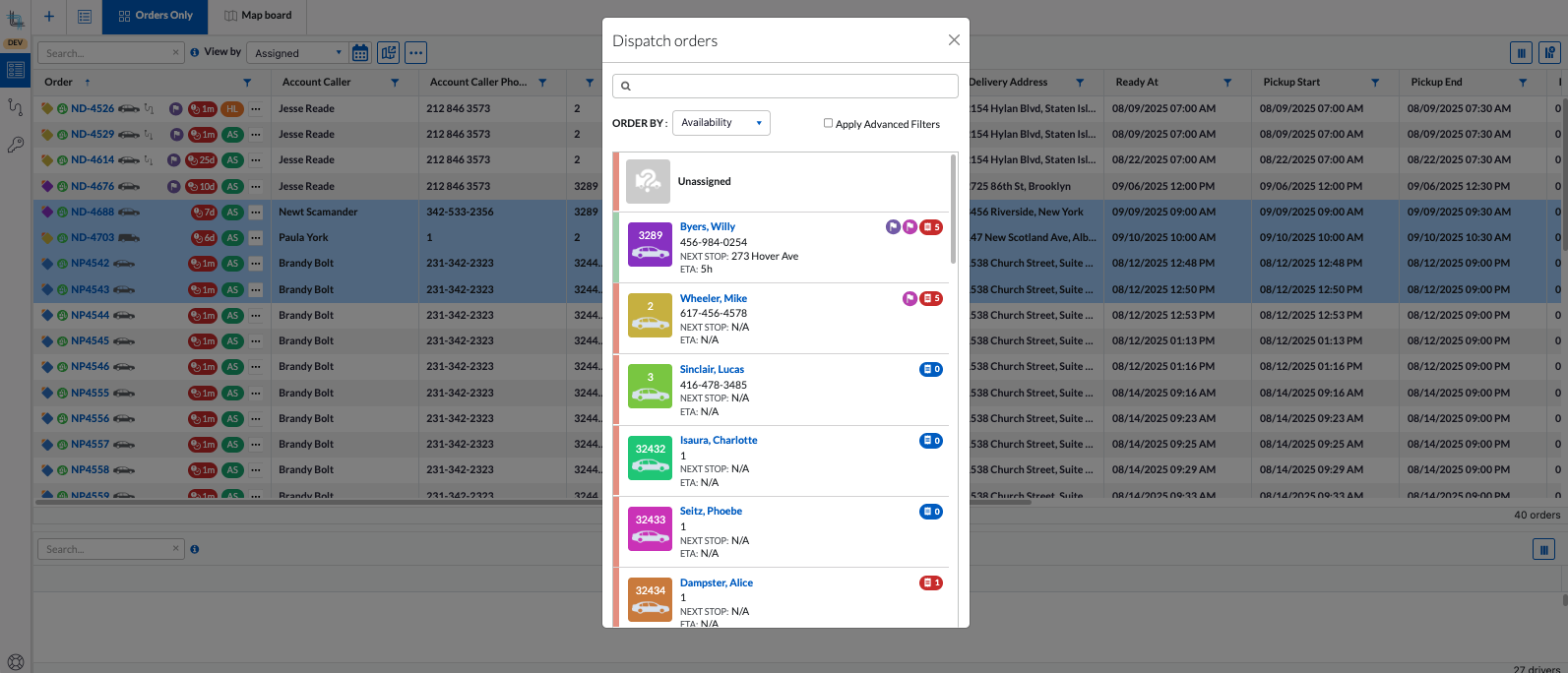 Dispatch Board: Where Dispatchers assign orders to drivers, get notifications for invalid orders, etc.