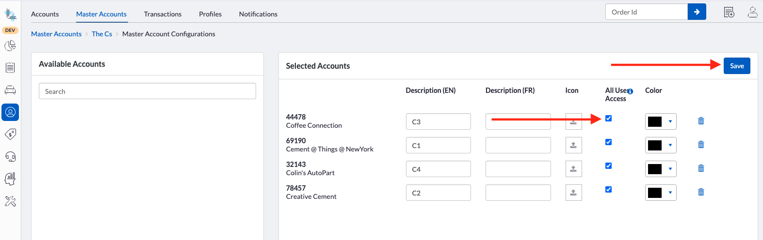 2) In the list of Accounts, uncheck one or more All User Access checkbox then click Save button: