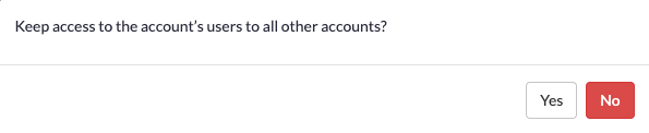 - No: Account users, from the Account-s that were unchecked, will have all access removed to all master accounts except their own.