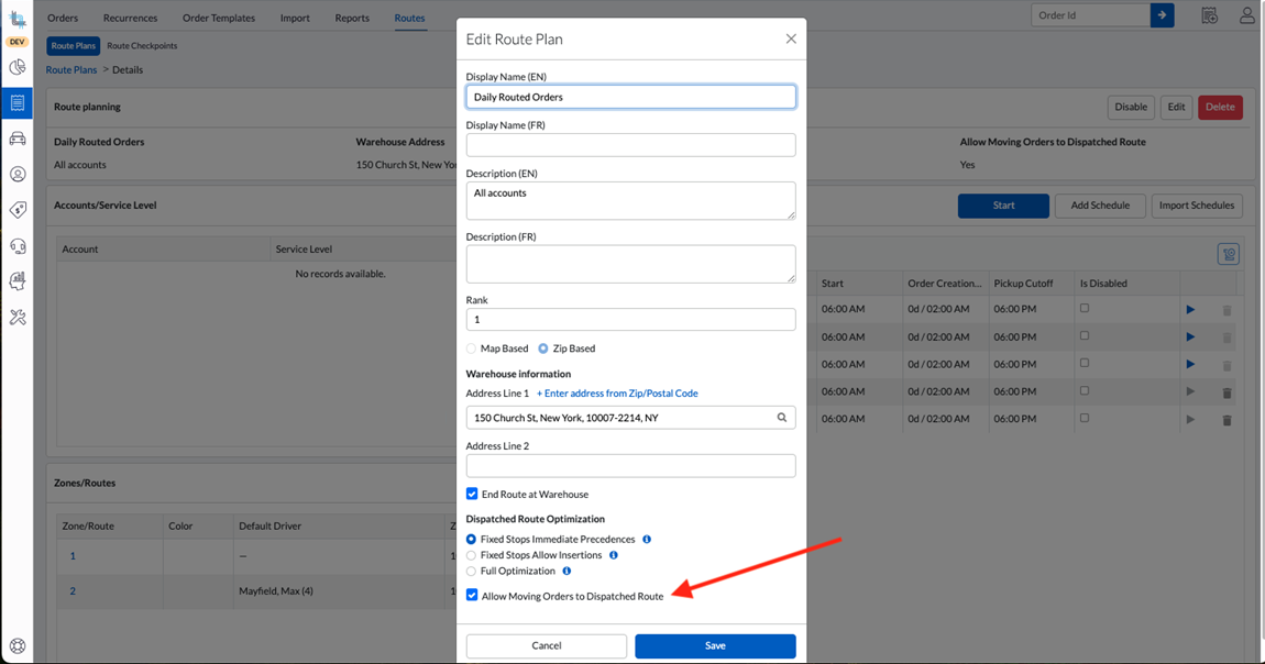 When Allow Moving Orders to Dispatched Route is enabled on a Route Plan, dispatchers can create manual routes on already-dispatched containers.