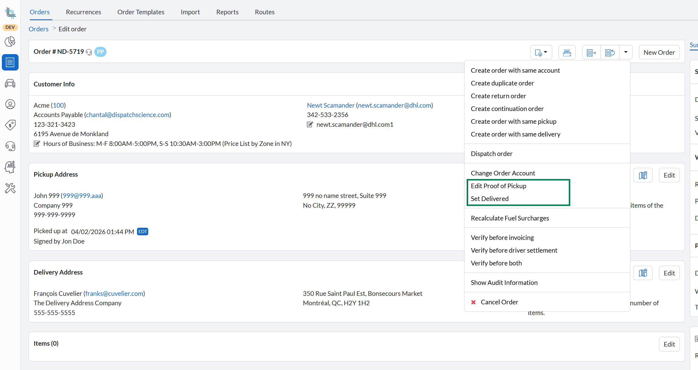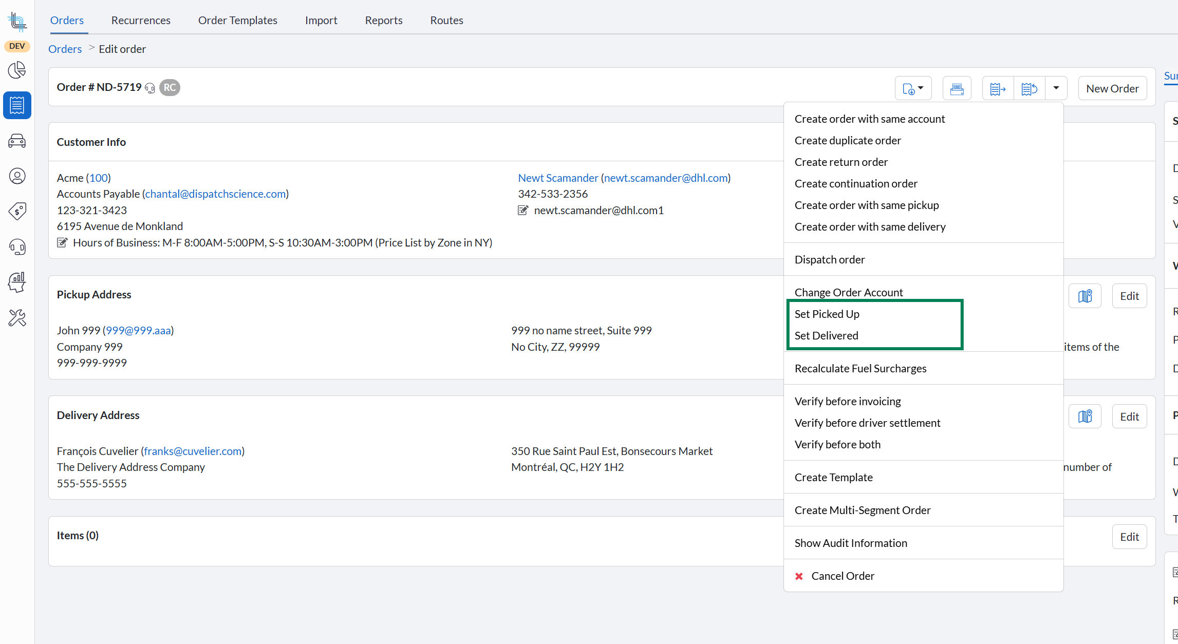 From the order action menu, select Set Delivered