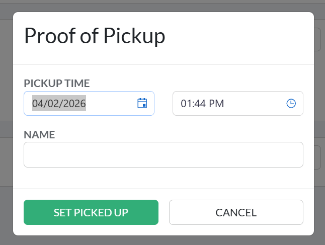 - Fill in the Proof of Pickup dialog box and confirm. Order status updates to Picked Up.