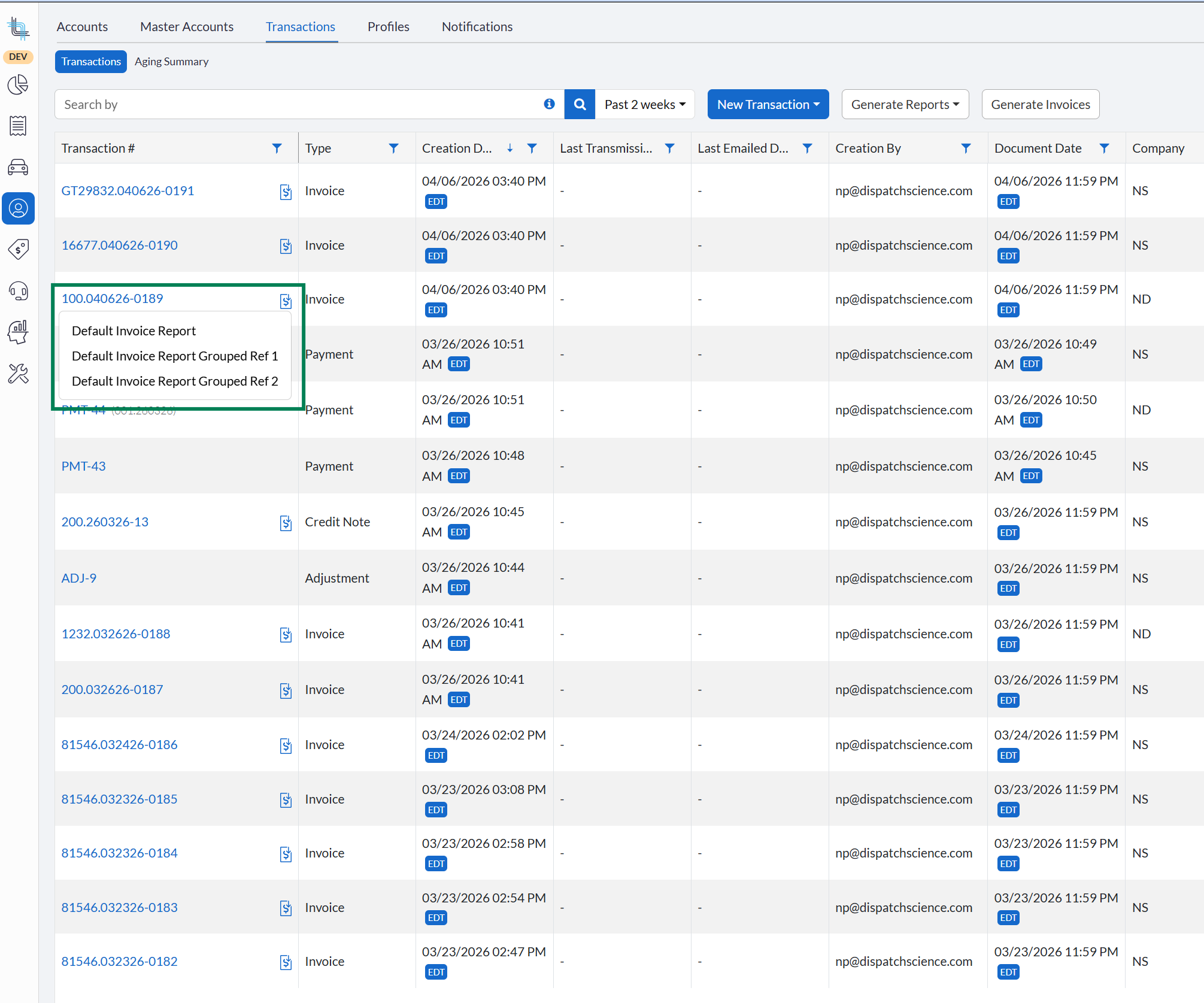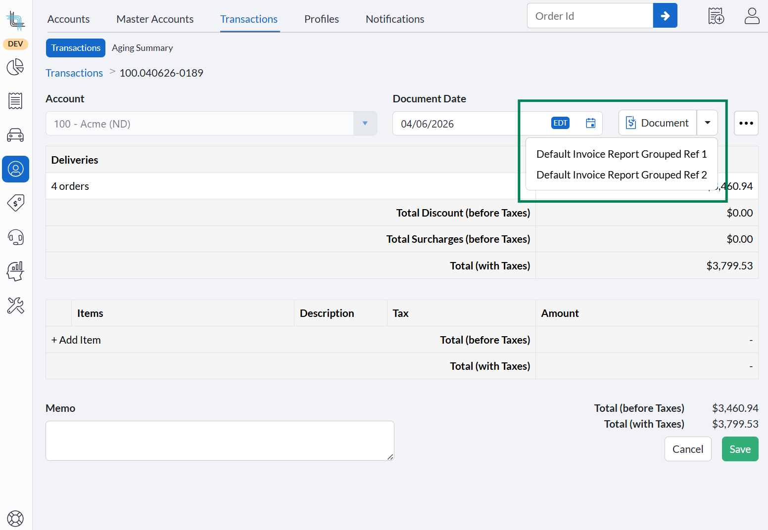 - On the Transactions Details screen of an invoice, the Document button will now allow the user to download the additional invoice reports, if configured. The same is also possible from the Transactions Search screen via the Invoice icon.