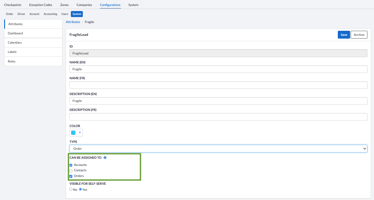 Attributes can be created, edited, archived and unarchived programmatically via the Tenant API, including attributes already in use.
