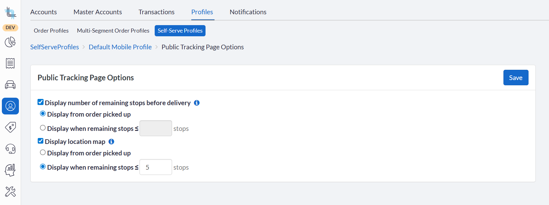 - New public tracking page with live driver map and remaining stop count