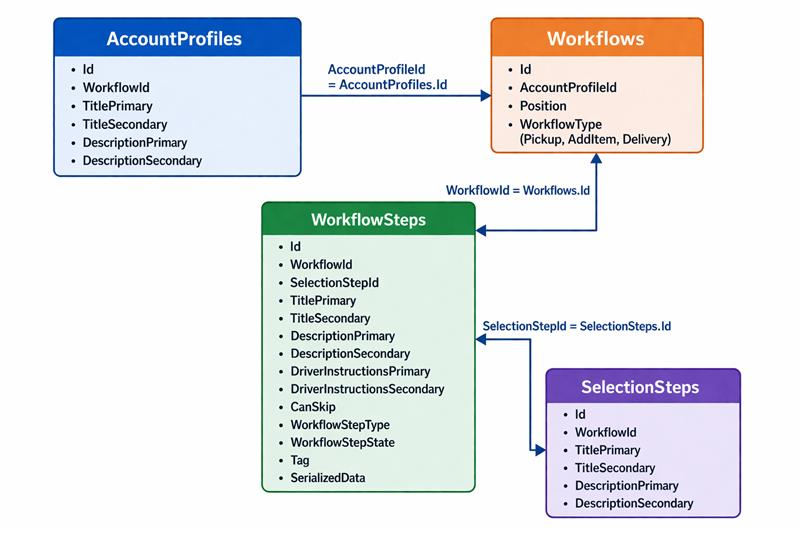 Id– ID of the WorkflowAccountProfileId– Links toAccountProfiles.IdPosition– Order of executionWorkflowType– (Pickup,AddItem,Delivery)