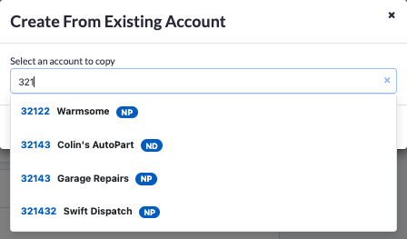 - A Create From Existing Account dialog box appears. Search by account name or number and select the account to copy. A minimum of 3 characters is needed to start the search.