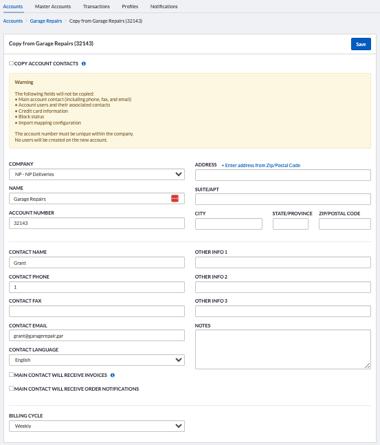 - If you wish to copy the contacts from the original account, check the Copy Account Contacts.